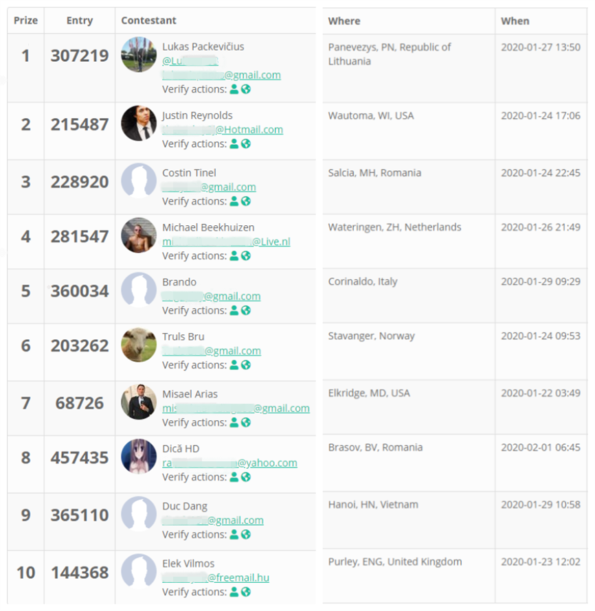 The 10 winners are randomly chosen by the third party gleam.io according to their entries as long as the event ends. The prize 2.3M coins & The list for 10 winners as follows,