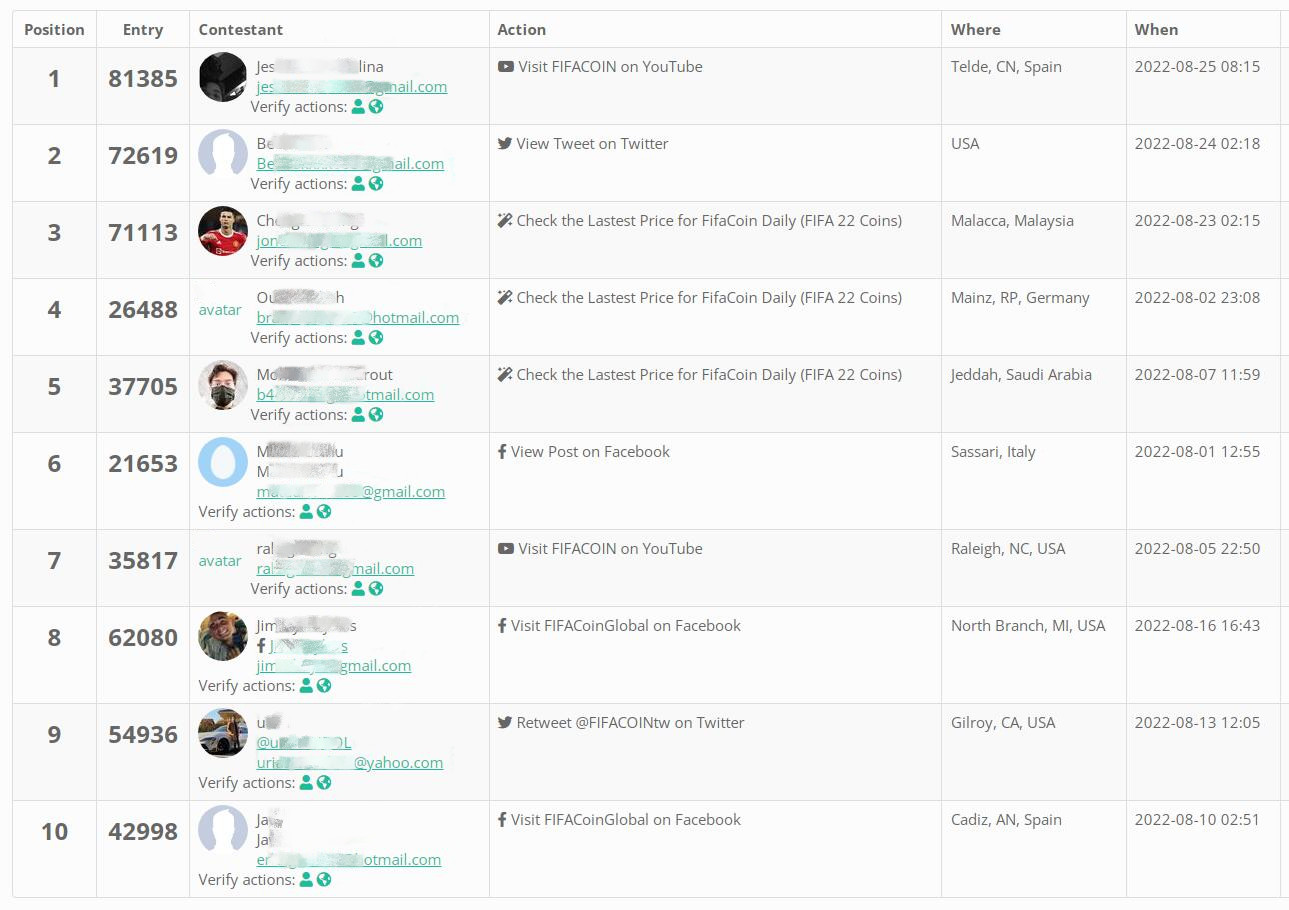 The last Giveaway of FUT 22 has come to an end. Thanks for everyone spending the time to join every event at FIFACOIN! Let's see the list of WINNERS together.The 10 winners have been randomly chosen by the third party Gleam. The higher the participation, the greater the chance of being selected! Check the prizes as follow now,